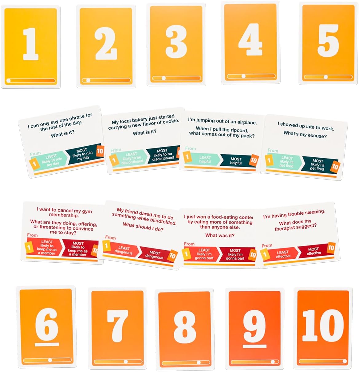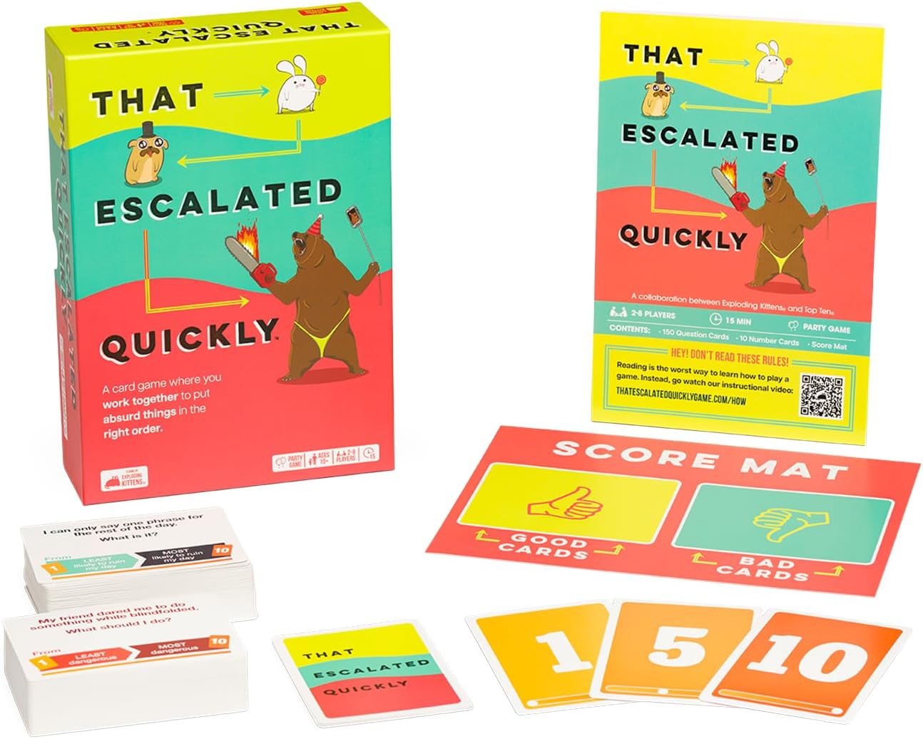 To play That Escalated Quickly, read out a simple question (ex. I’m locked in a tiny room. What else is locked in here with me from cutest to scariest). Then everyone is assigned a secret number from one to ten. Next, each player answers the question, and the intensity of that answer is based on their secret number (ex. 1= a bunny, 10= a grizzly bear with chainsaw arms.) Finally, the person who read the question has to try and sort those answers into the correct order. If they get it right, everyone wins! This game is hilarious, energetic, and a great way to get to know your friends and family a little bit better.